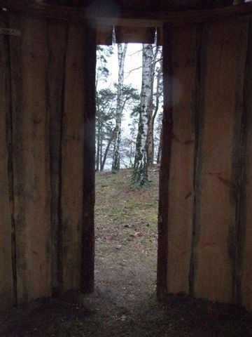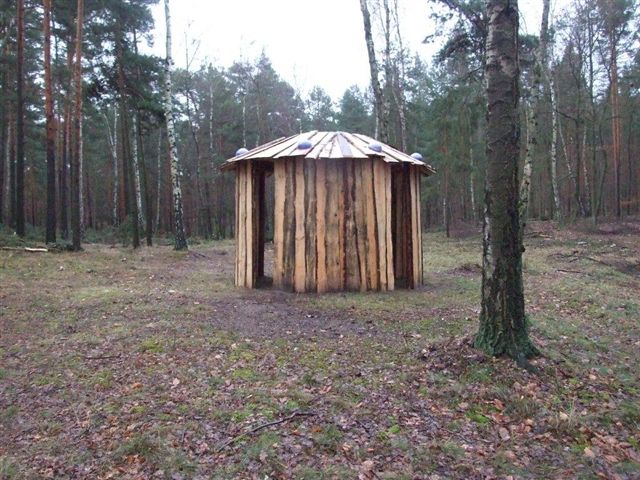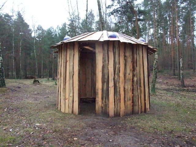 eine runde Holzhütte mit vier Ein-und Ausgängen zu