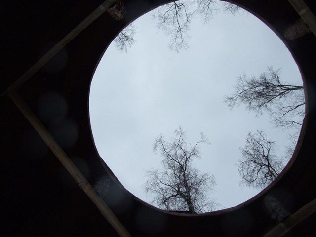 Im Innenraum stehen vier Baumstämme als Sitzgelegenheit.